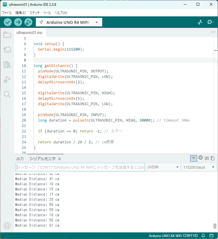 Grove超音波センサーを用いた距離測定と、中央値による値の安定化を行います。
